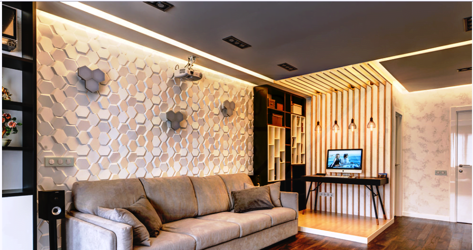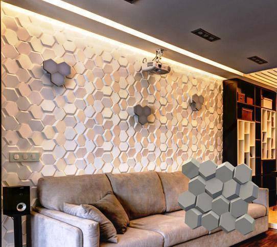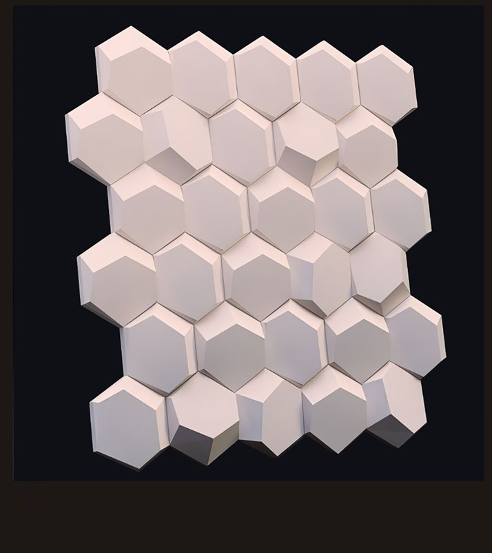 3D панель из гипса «Улей» — одно из самых интересных и оригинальных предложений компании A7Studio. Вдохновлённые правильной формой пчелиных сот, художники разместили шестиугольники под разными углами, что позволило добиться поразительного эффекта и создать чрезвычайно выразительный отделочный материал.
