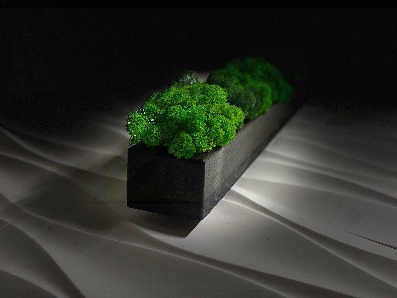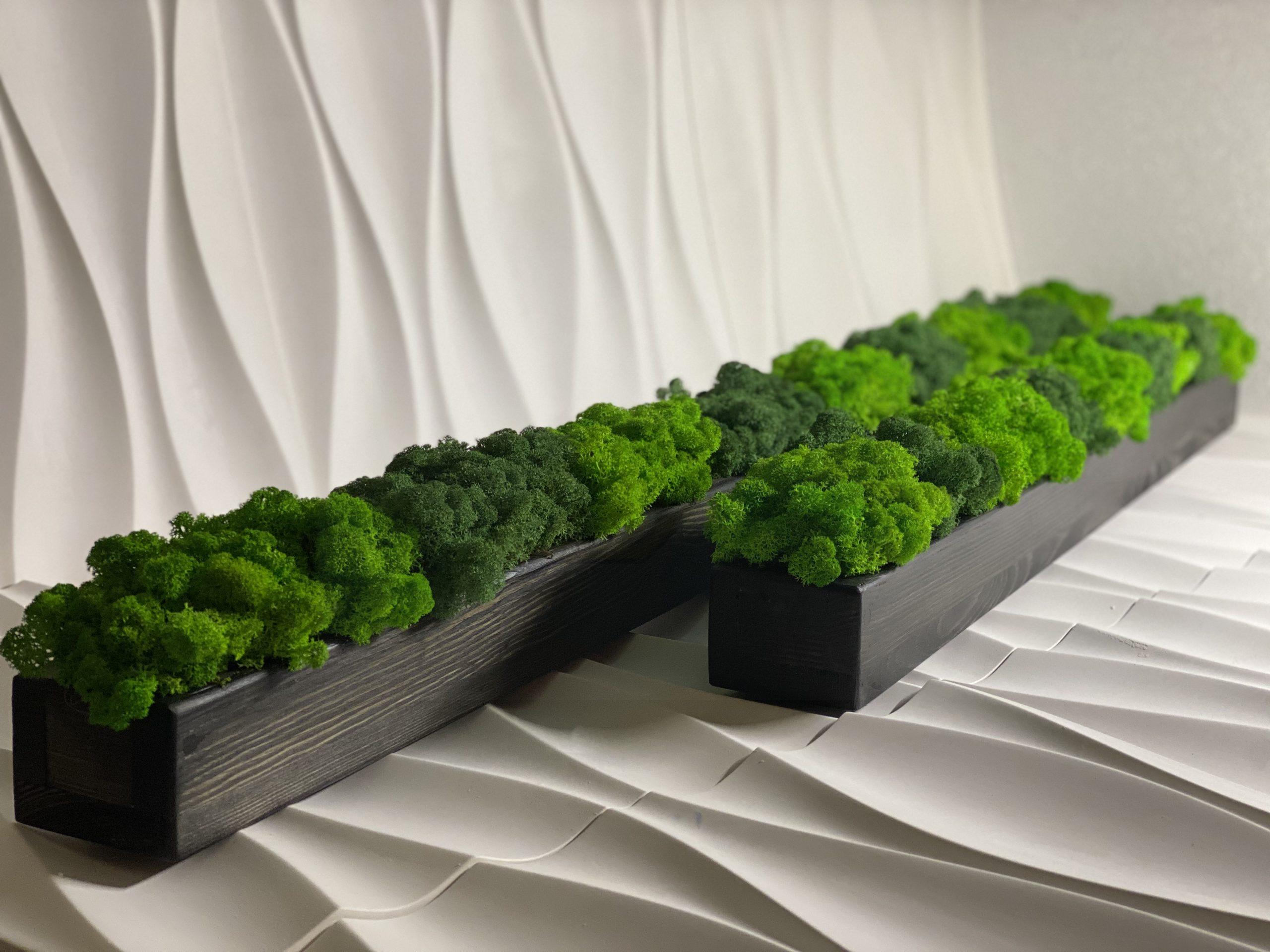 Деревянное кашпо с стабилизированным мхом — новаторских метод обновления интерьера. Тренд последних лет. При отделке скандинавского мха используются только натуральные материалы, поэтому он абсолютно экологичен и рекомендуется в качестве естественного индикатора влажности.