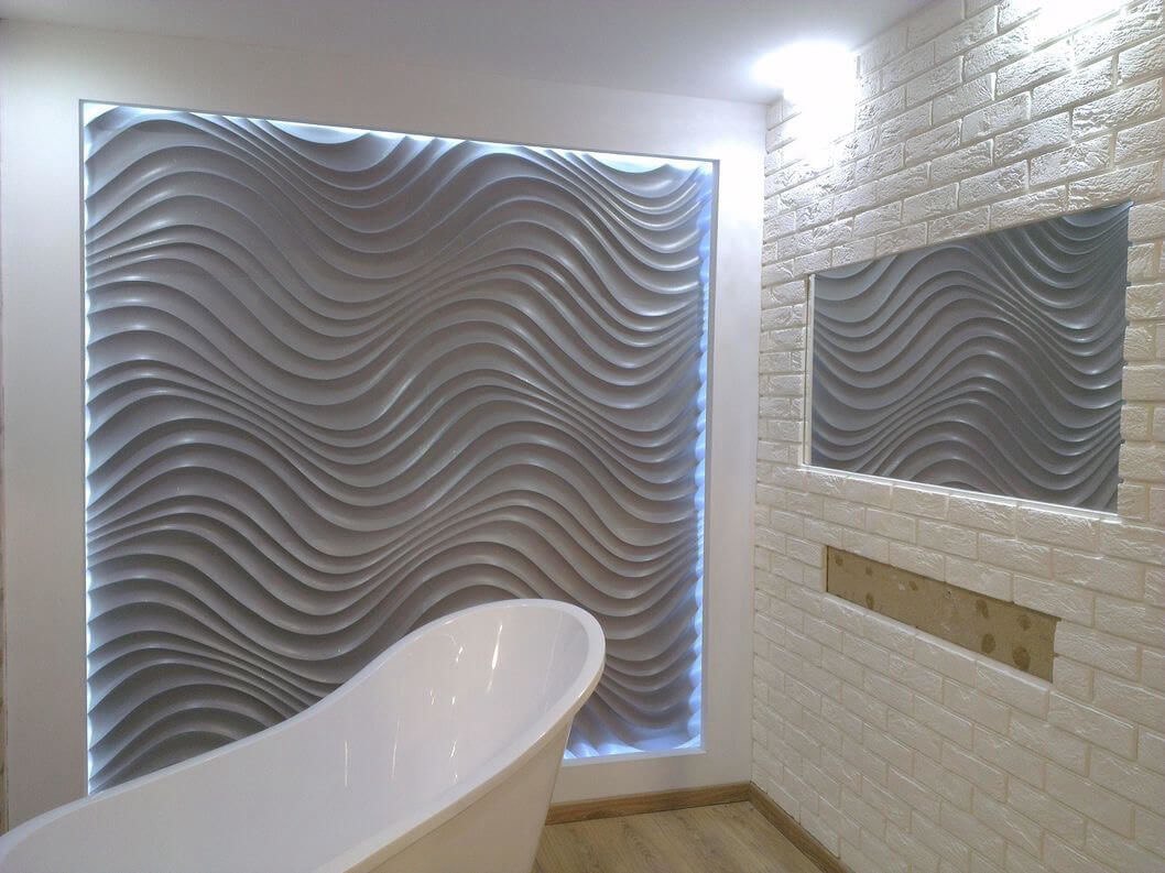 Гипсовая декоративная 3D панель «Гребешки» является трендом в современном дизайне интерьеров. Множество поперечных волнистых линий создают оригинальную фактуру, которая гармонично сочетается с блестящими мраморными поверхностями, стеклом и металлом. Дизайнеры активно используют эти панели в комбинации с деревом, что добавляет особый уют в помещение. Панель «Гребешки» идеально подойдет для оформления спальни, гостиной или гостиничного номера, а дополнительная подсветка усилит эффект игры теней.
